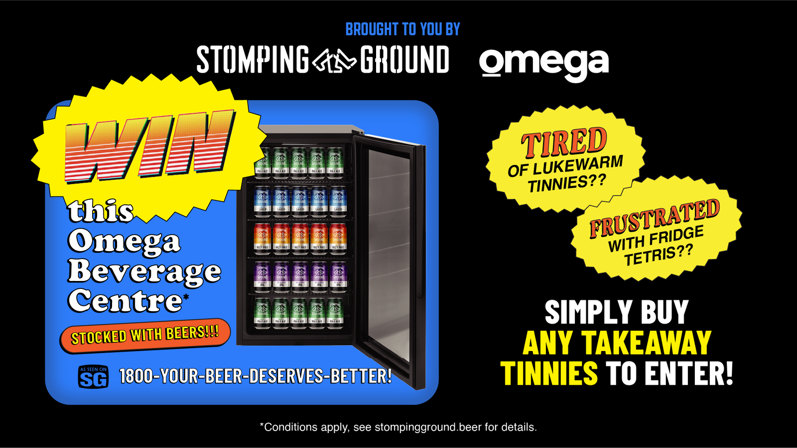 Prize: 1x Omega 102 Can Beverage Centre (model OCBFS102SB) valued at approximately $819 (RRP) and 36x 355ml cans of assorted Stomping Ground Brewing Co. beer