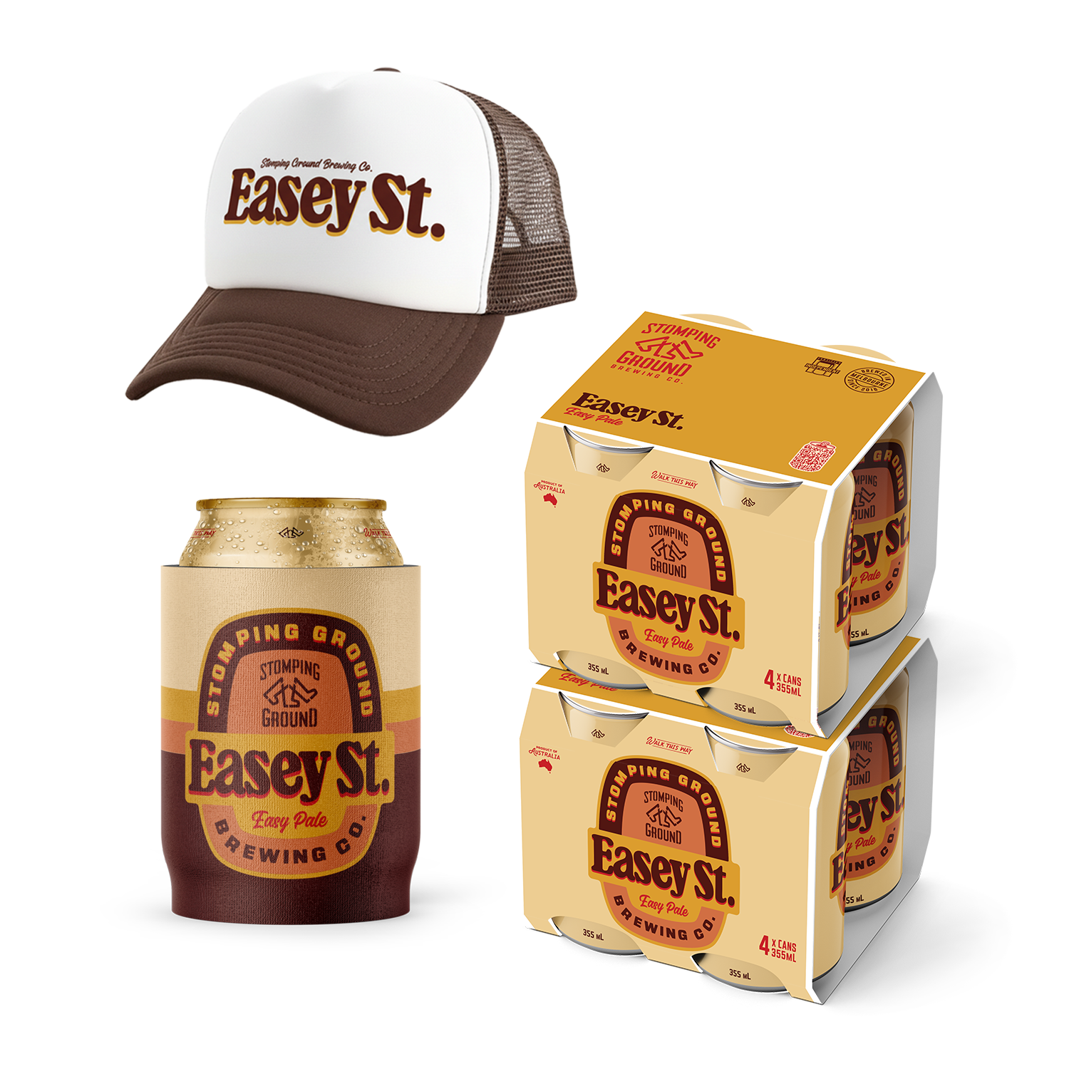 What’s inside:• 1x Easey St. Trucker Hat• 1x Easey St. Stubby Holder• 2x 4 Pack Easey St. Easy Pale